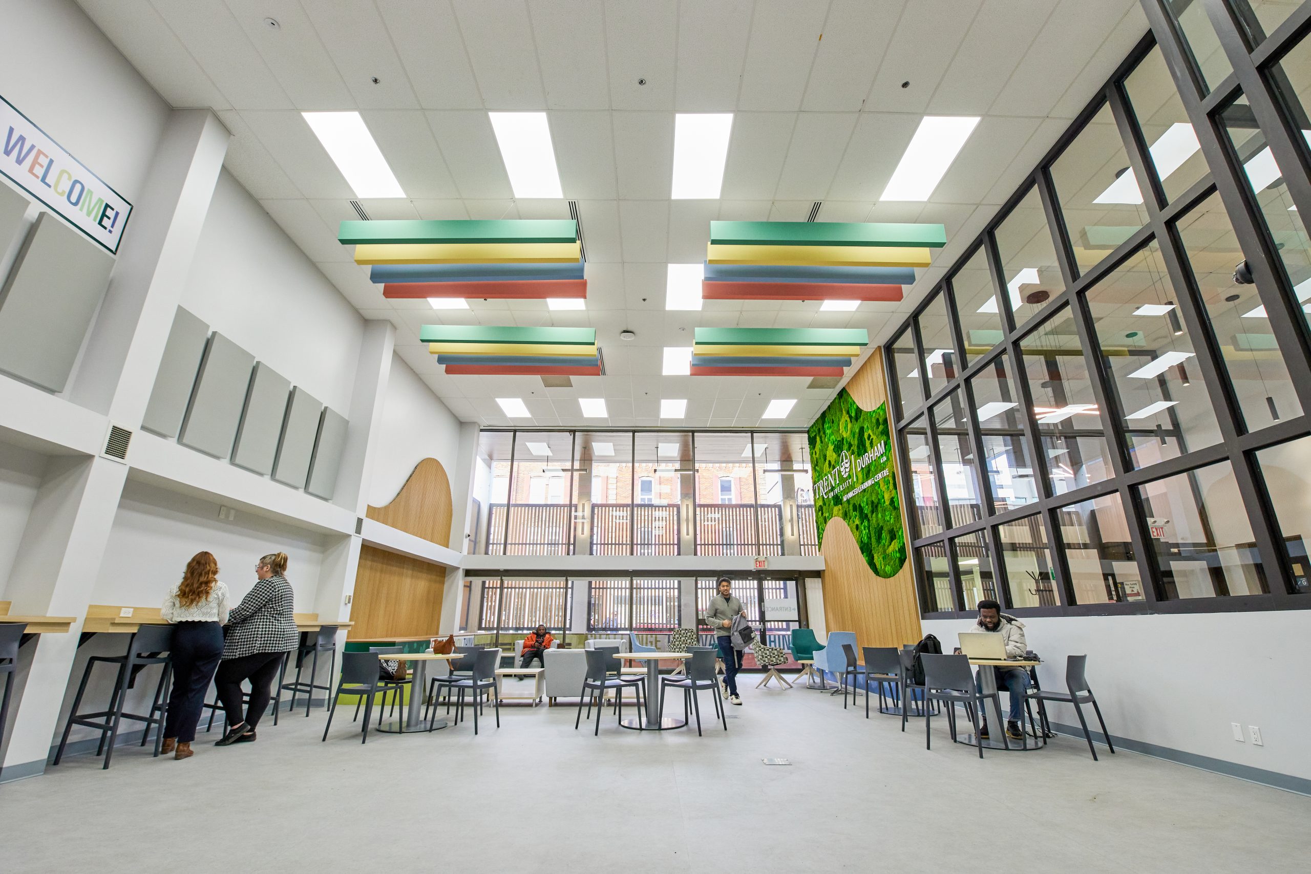 The project’s exterior underwent a remarkable transformation as well. A new outdoor/indoor space was established for student use, carefully crafted with structural steel, specialty rubber flooring, wood slat siding, and inviting benches. Additionally, new vestibule doors and façade adjustments enhanced the building’s overall aesthetic.